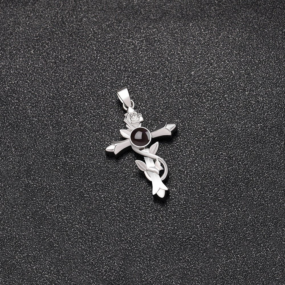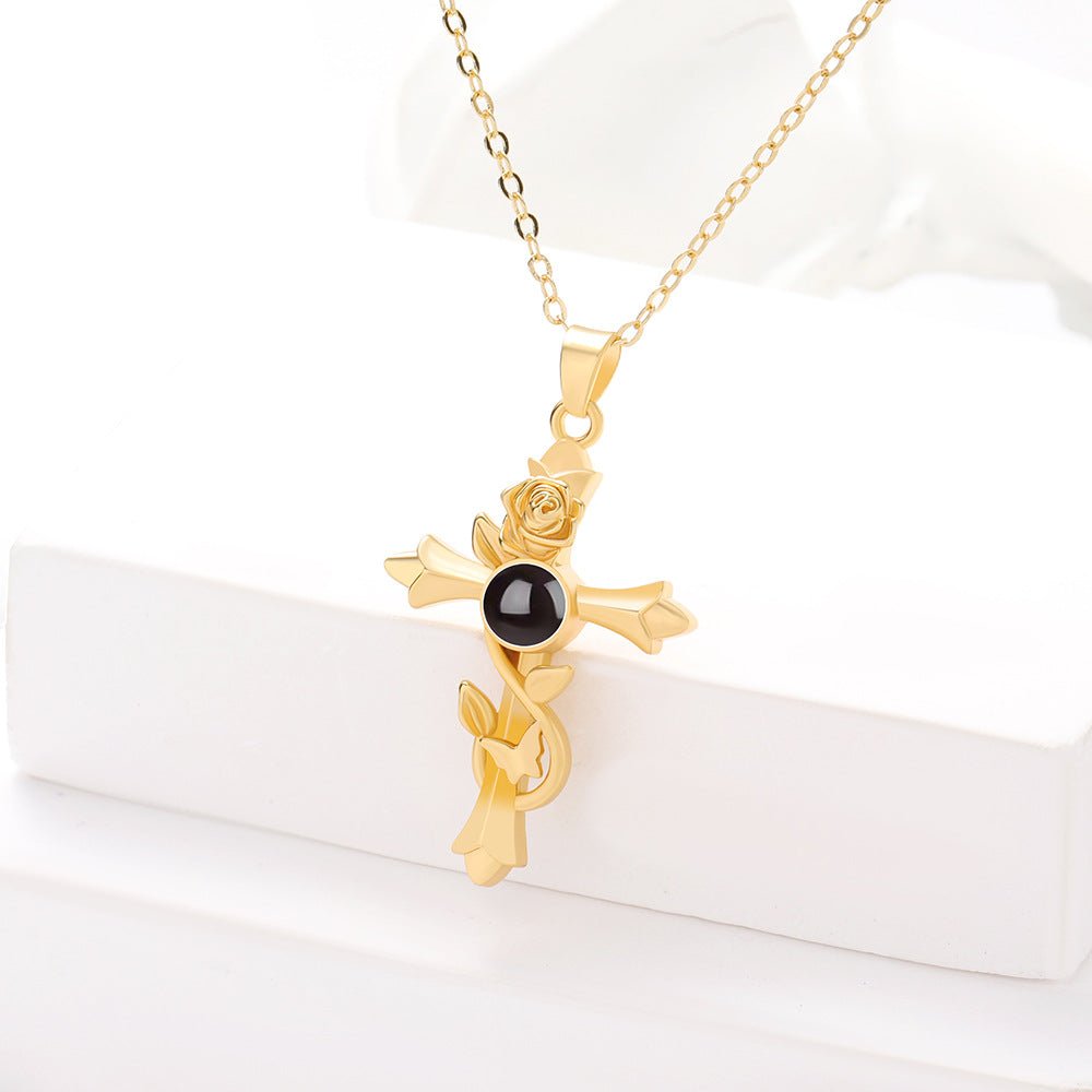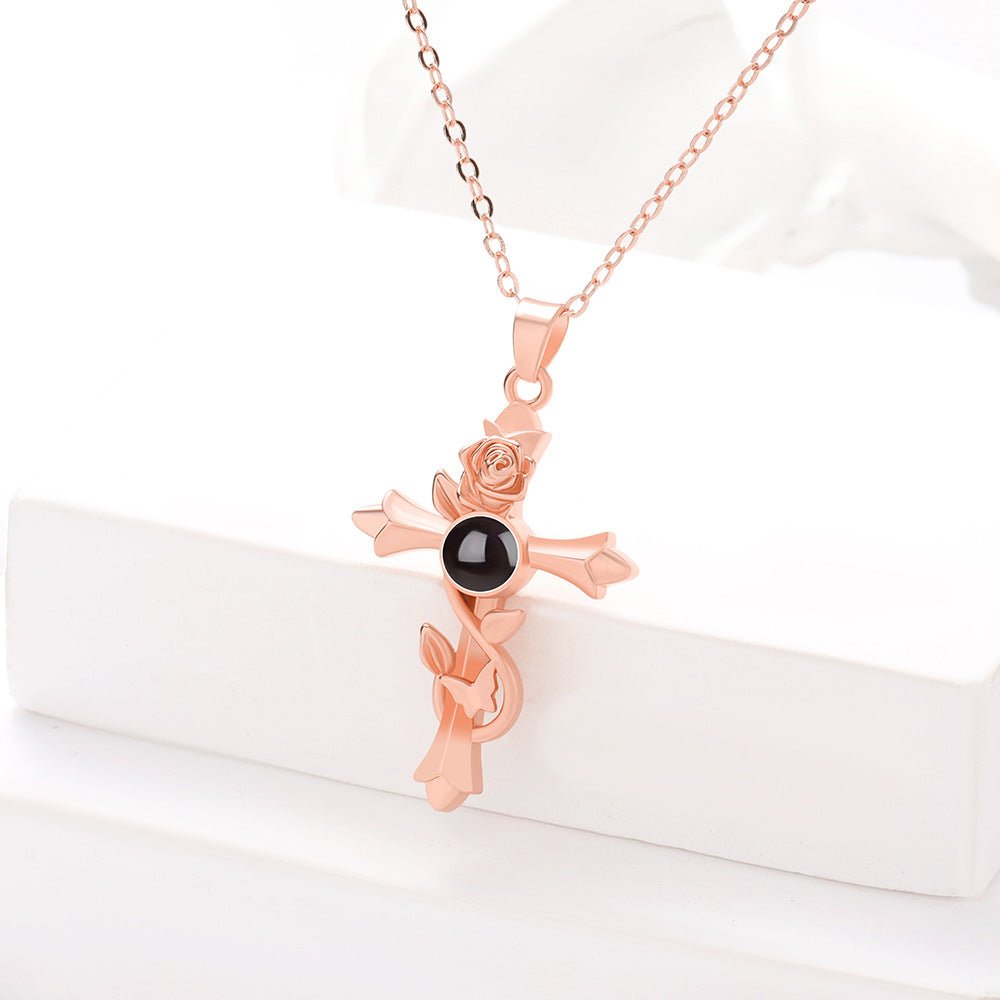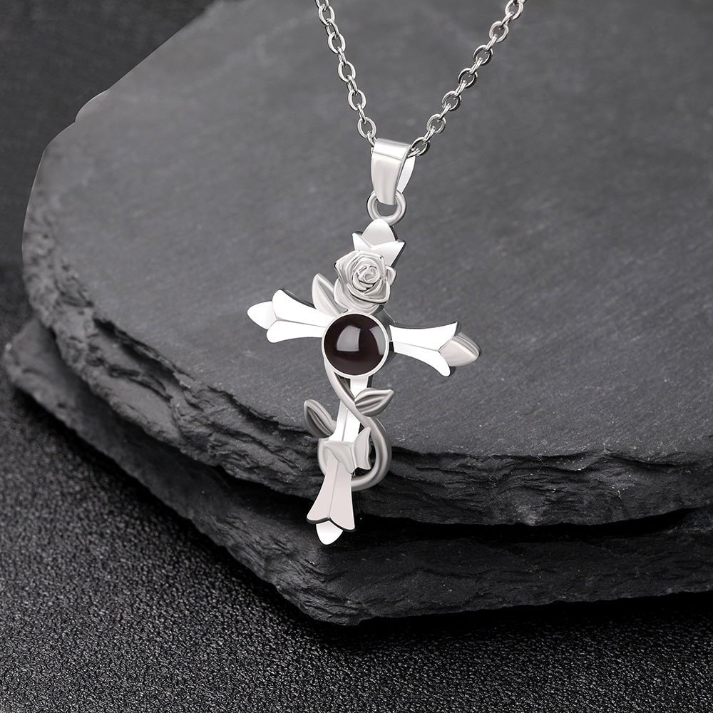 Benutzerdefinierte versteckte Fotoprojektion Vintage Rose Kreuz Halskette