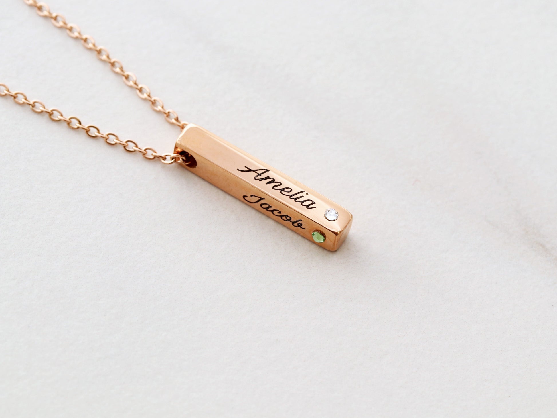 Notre barre à 4 côtés peut être personnalisée avec des pierres de naissance et une date, des statistiques de naissance, un nom, un lieu, un mot ou une phrase et jusqu'à 4 côtés gravés.