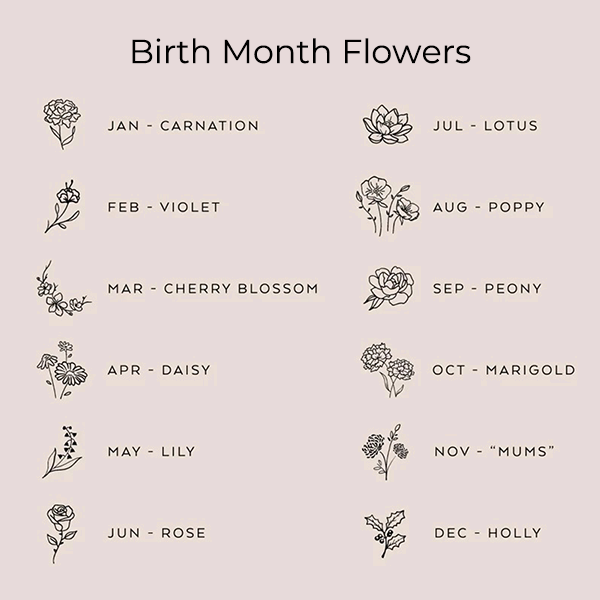• Fleur de naissance personnelle – Incluez une fleur de naissance pour représenter votre mois de naissance, ajoutant une touche unique et personnelle.