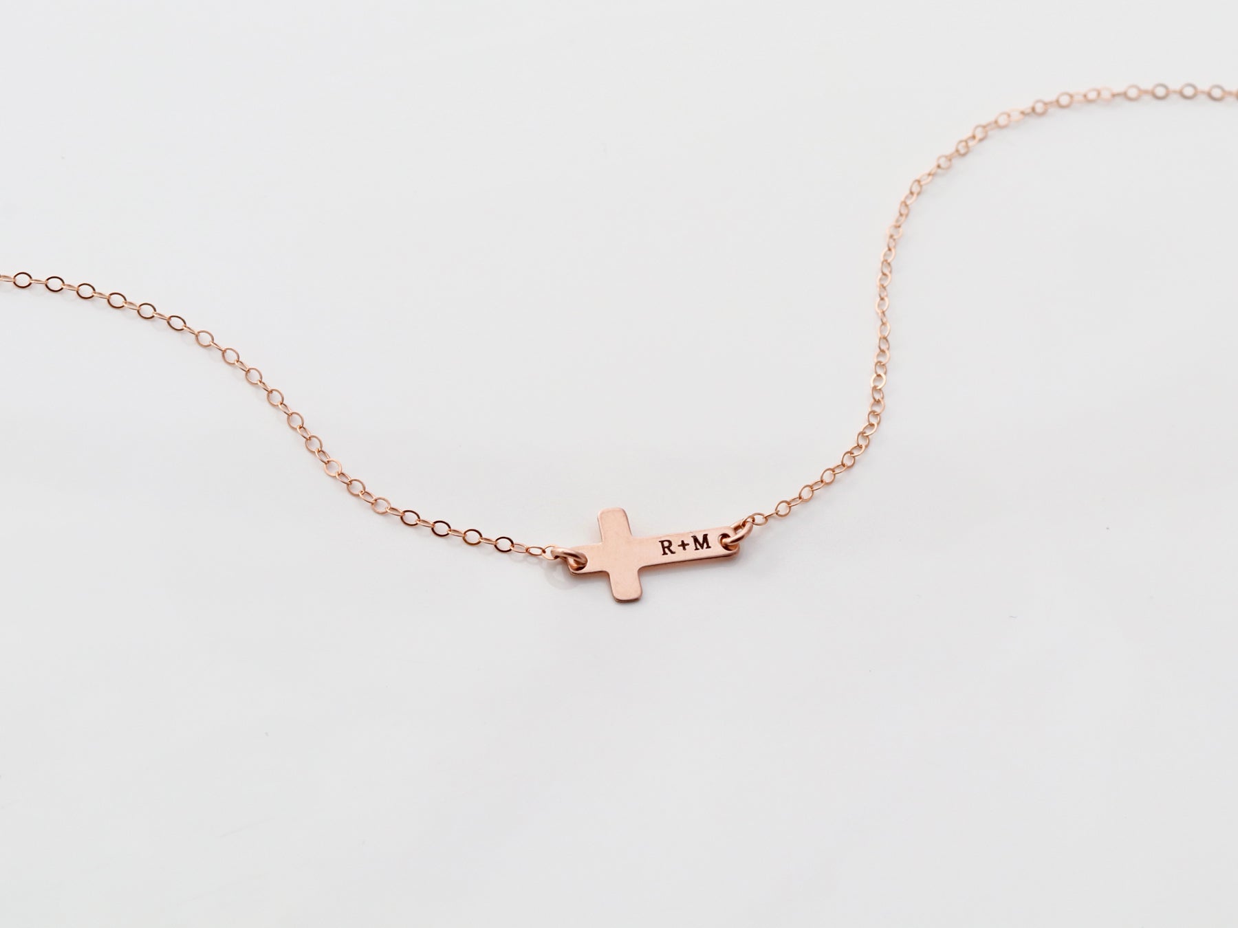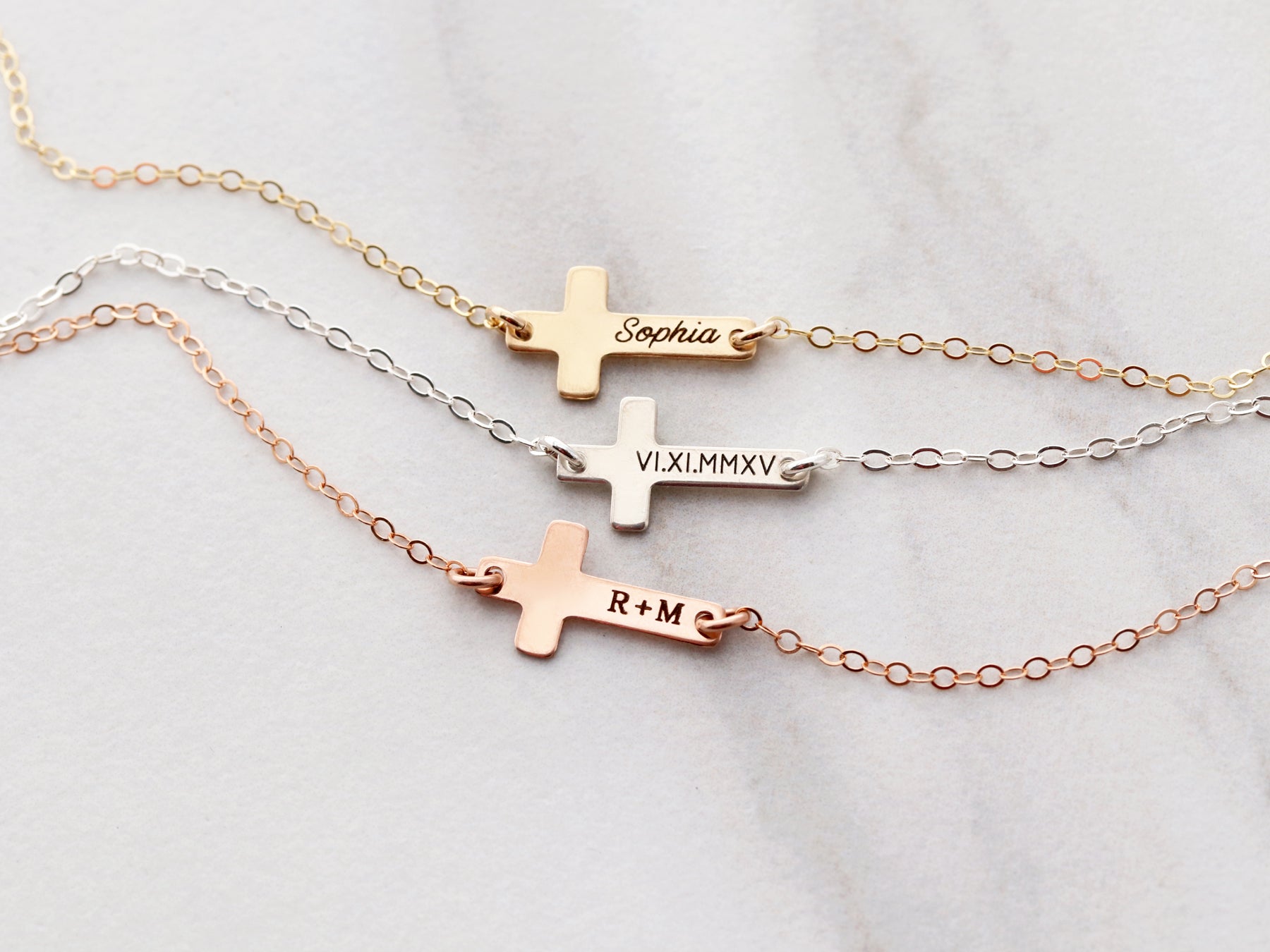 Notre collier croix personnalisé peut être gravé d'un nom, d'une date, d'un mot spécial ou d'une référence biblique pour l'emporter partout avec vous. Fabriqué en argent sterling, plaqué or et plaqué or rose.