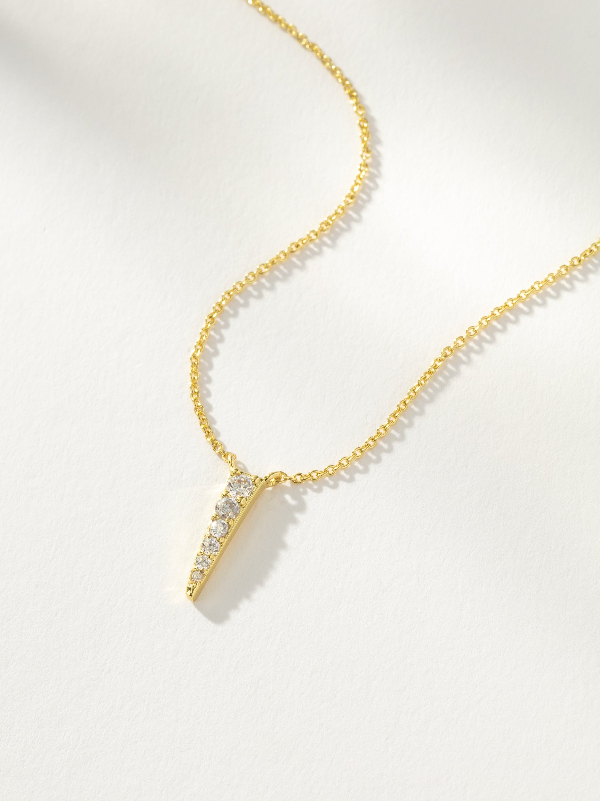 Ce collier en or est la reine des superpositions. Doté d'une délicate chaîne en or et d'un pendentif pavé triangulaire, notre collier Cutting Edge s'intègre parfaitement à votre look quotidien. Pour reproduire la collection de colliers de Kristin, associez-le à notre collier Glam Lariat , notre collier Charming et notre collier Ready to Mingle 2.0 .