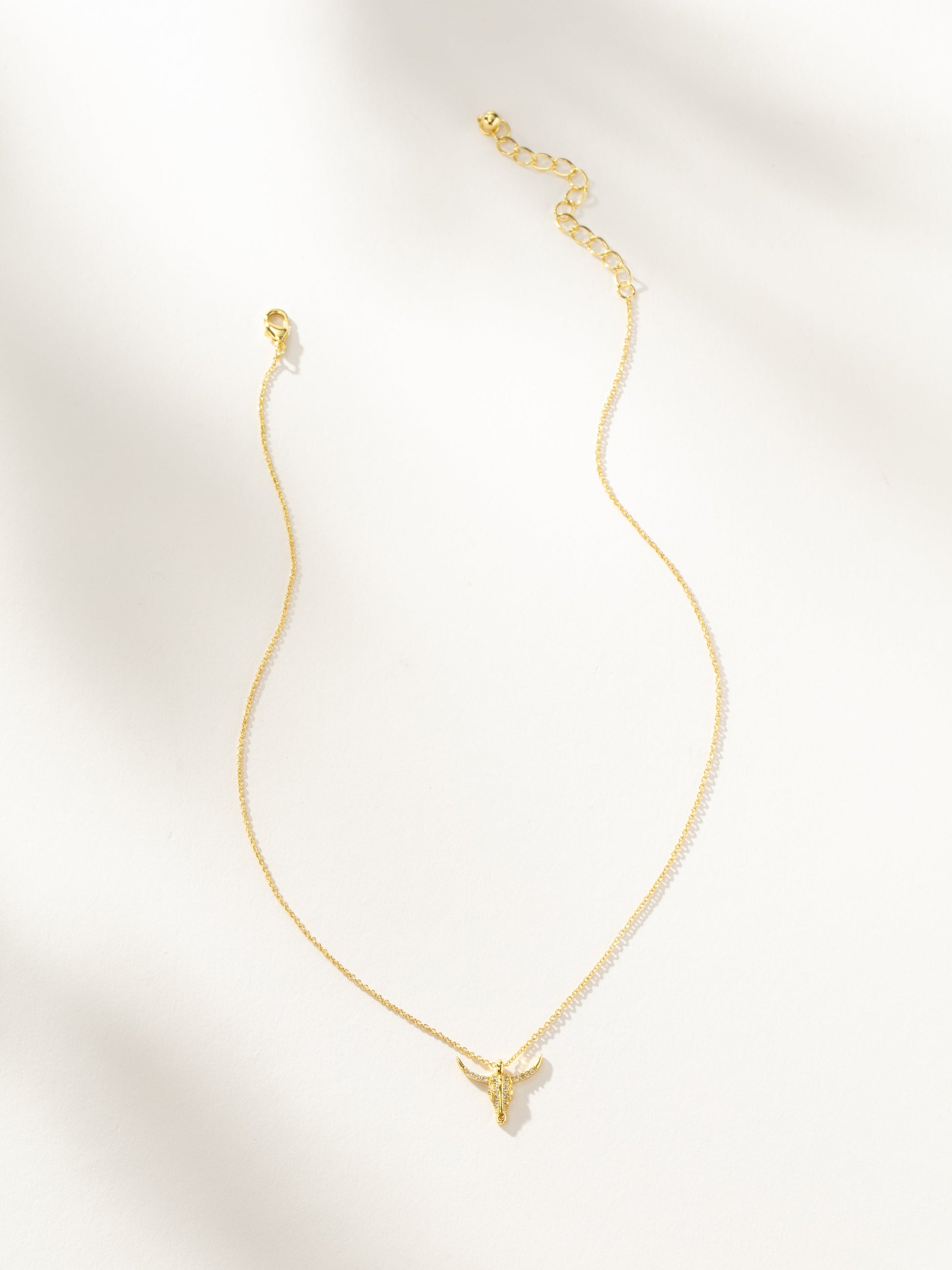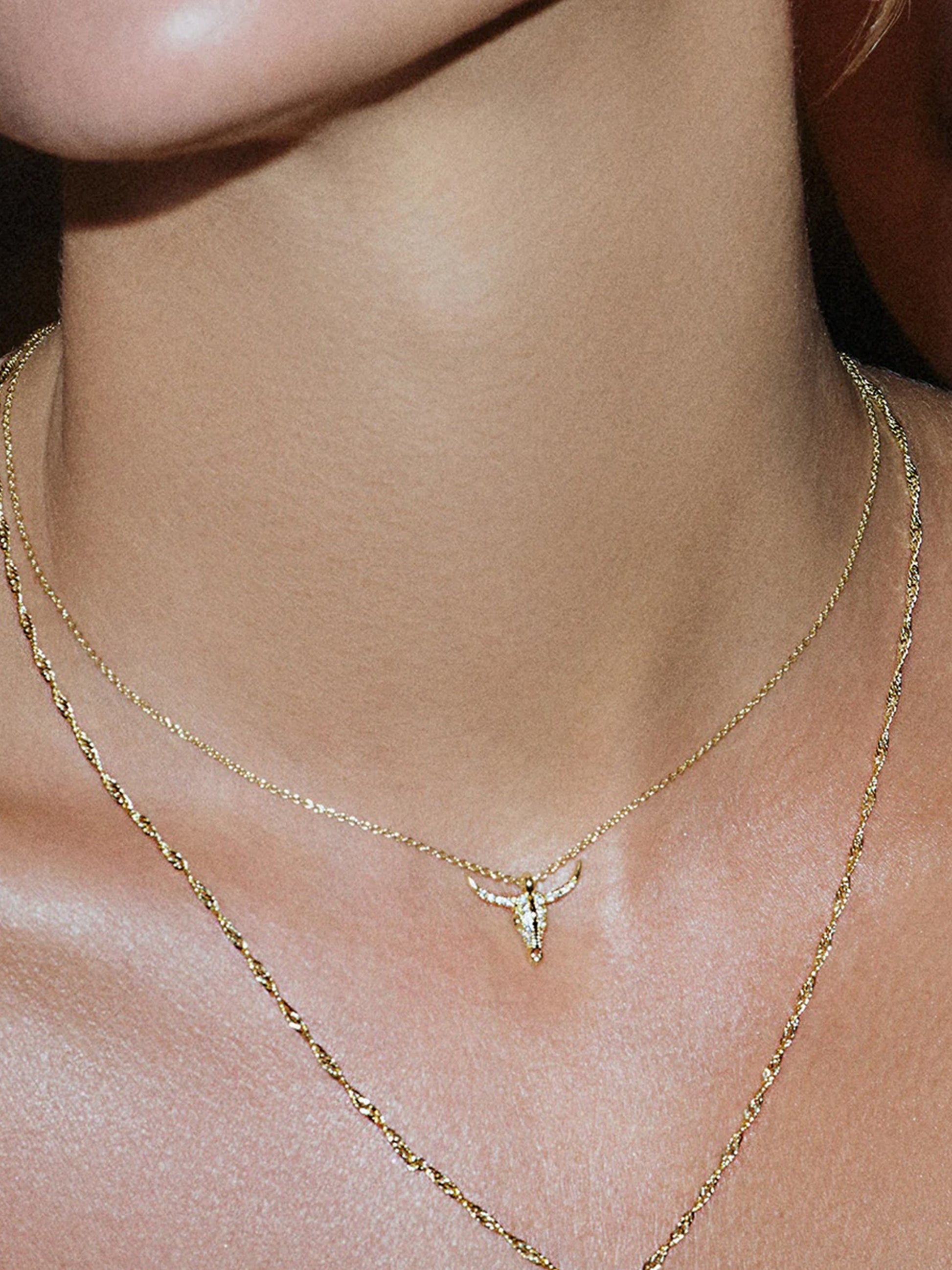 Notre collier Fighter, best-seller, brille encore davantage ! Composé d'un pendentif longhorn, d'une chaîne et de pierres pavées, ce collier est un incontournable. Pour un look complet, associez le collier Fighter 2.0 à nos puces d'oreilles Fighter .