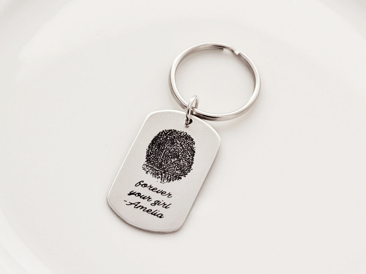 Empreintes de vos proches à emporter partout avec vous. Il s'agit de véritables empreintes digitales, de mains, de pieds et de pattes gravées sur nos plaques métalliques. Préservez le passé avec ces porte-clés personnalisés.