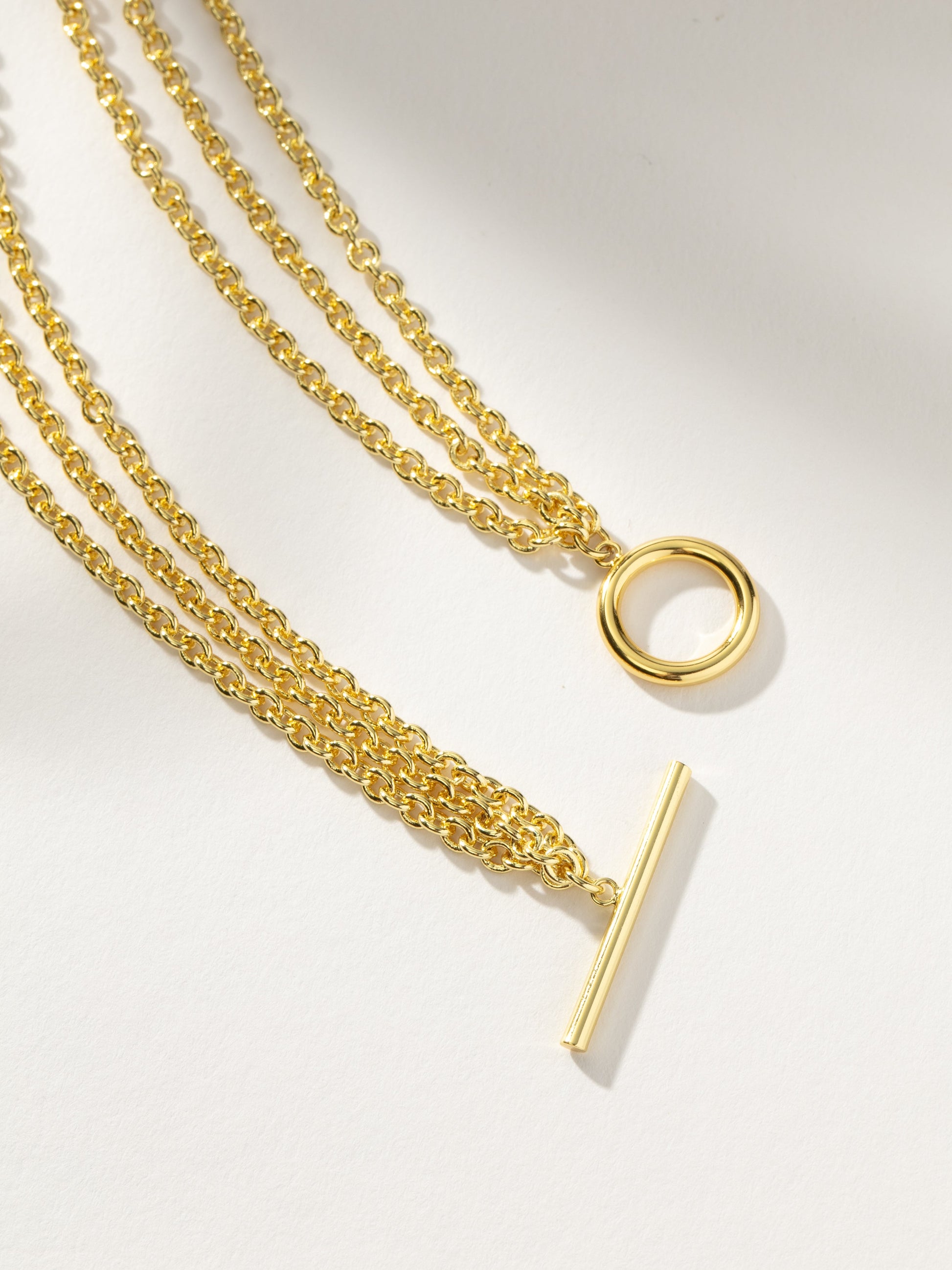 Trois chaînes en or classiques s'unissent à un grand fermoir en or pour créer notre collier triple chaîne emblématique. Ce collier en or est tout ce qu'il vous faut pour un look superposé sans effort.