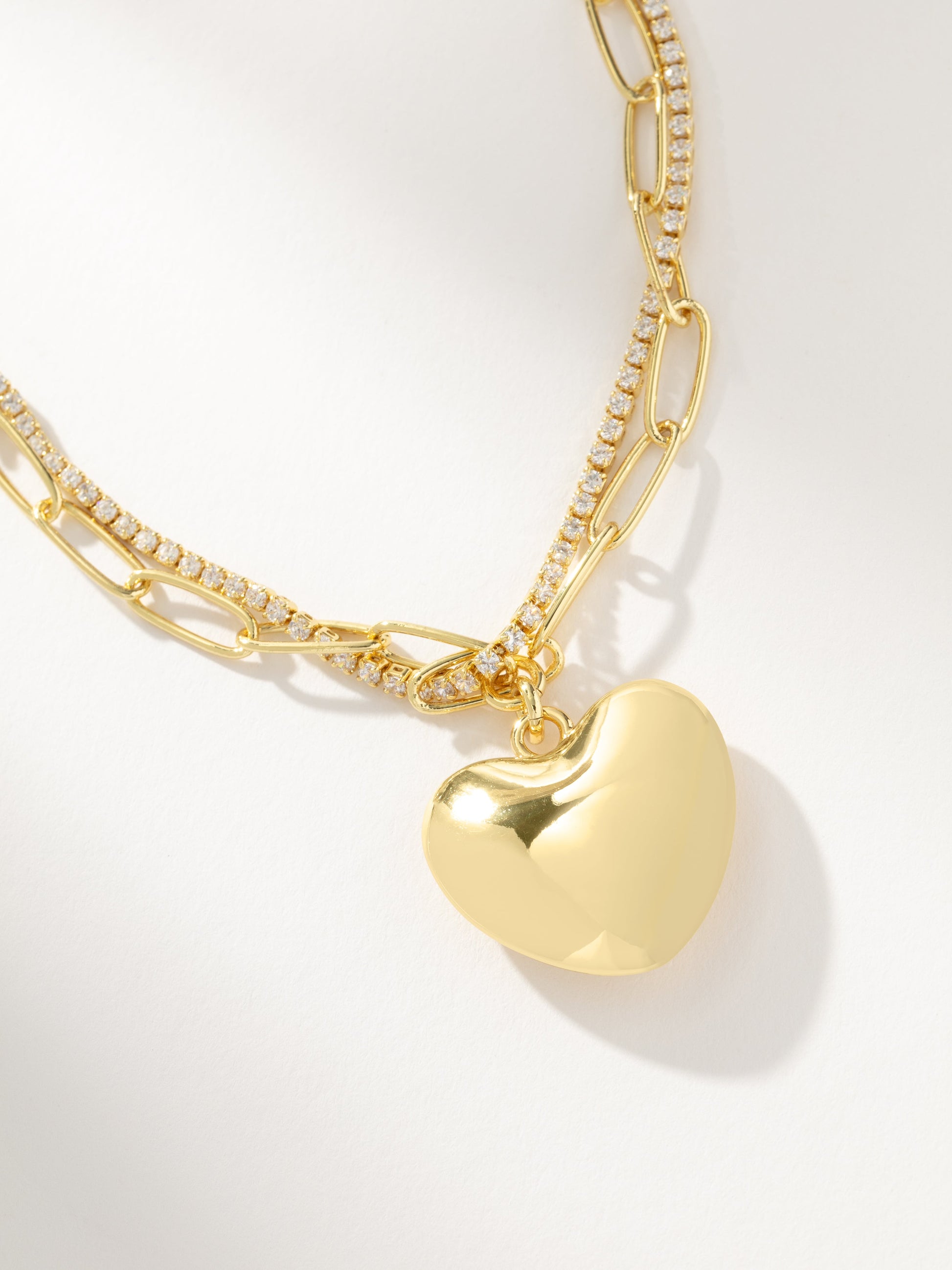 Il y a quelque chose d'audacieux dans un collier cœur qui nous fascine. Notre collier chaîne et cœur entrelacés est composé d'une chaîne trombone et d'un collier clouté en or entrelacé d'un pendentif cœur en or : il est tout simplement parfait.