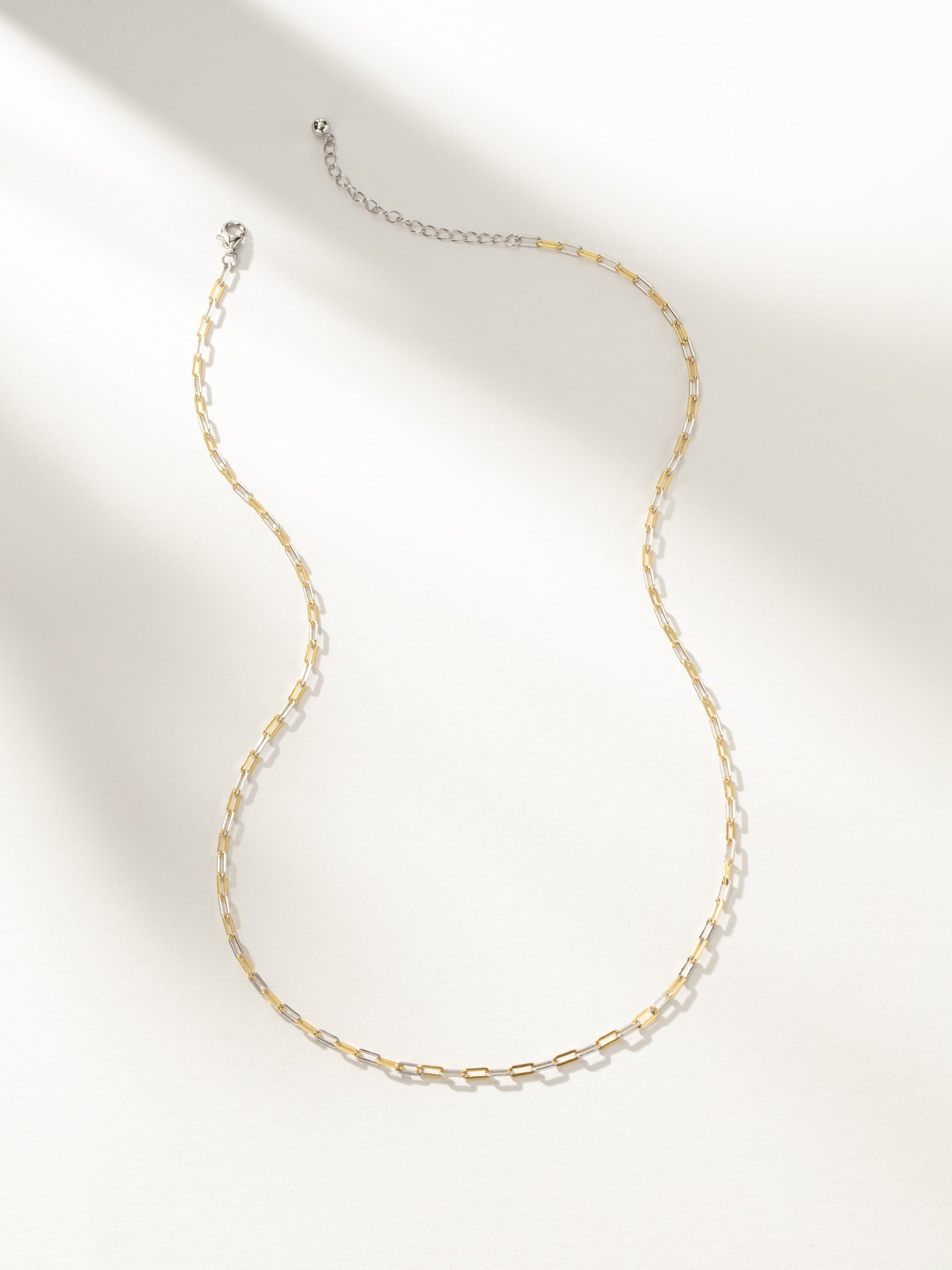 Ajoutez une touche d'amour et de mélange de métaux à votre collection de colliers avec notre collier chaîne trombone délicat. Confectionné en vermeil or 18 carats et argent sterling, ce collier chaîne délicat est la pièce de superposition qu'il vous manquait. Pour un look complet, superposez-le à tous vos autres colliers chaîne préférés.