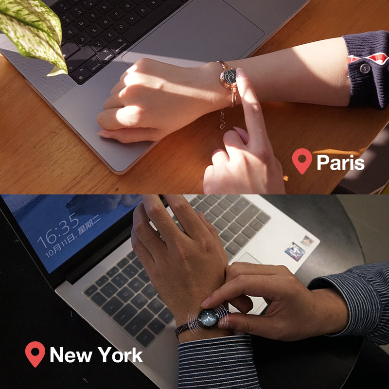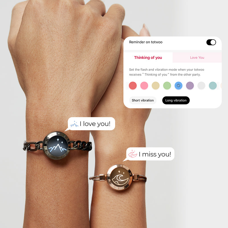 Tapotez votre bracelet pour faire vibrer et illuminer l'autre, montrant ainsi que vous pensez à l'être aimé. Ces bracelets d'amour vous permettent de rester connectés et de renforcer votre relation, quelle que soit la distance.