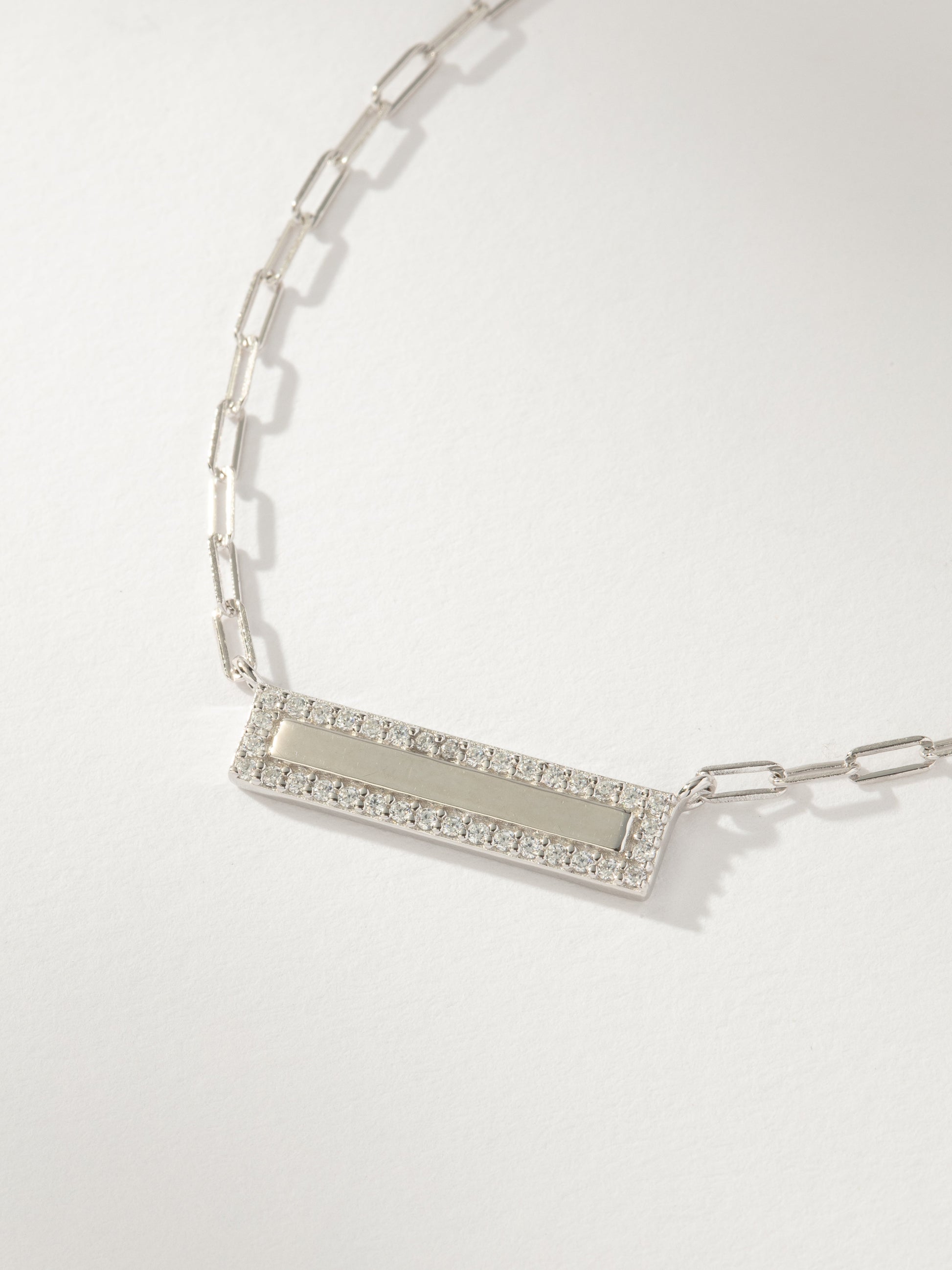 Ajoutez une touche d'éclat à votre look avec notre collier chaîne et barre pavée. Ce collier en argent sterling est composé d'une mini-chaîne trombone, d'une barre en argent et de détails pavés pour une brillance accrue. Pour un look entièrement argenté, associez-le à l'un de nos bijoux en argent ou en argent sterling .