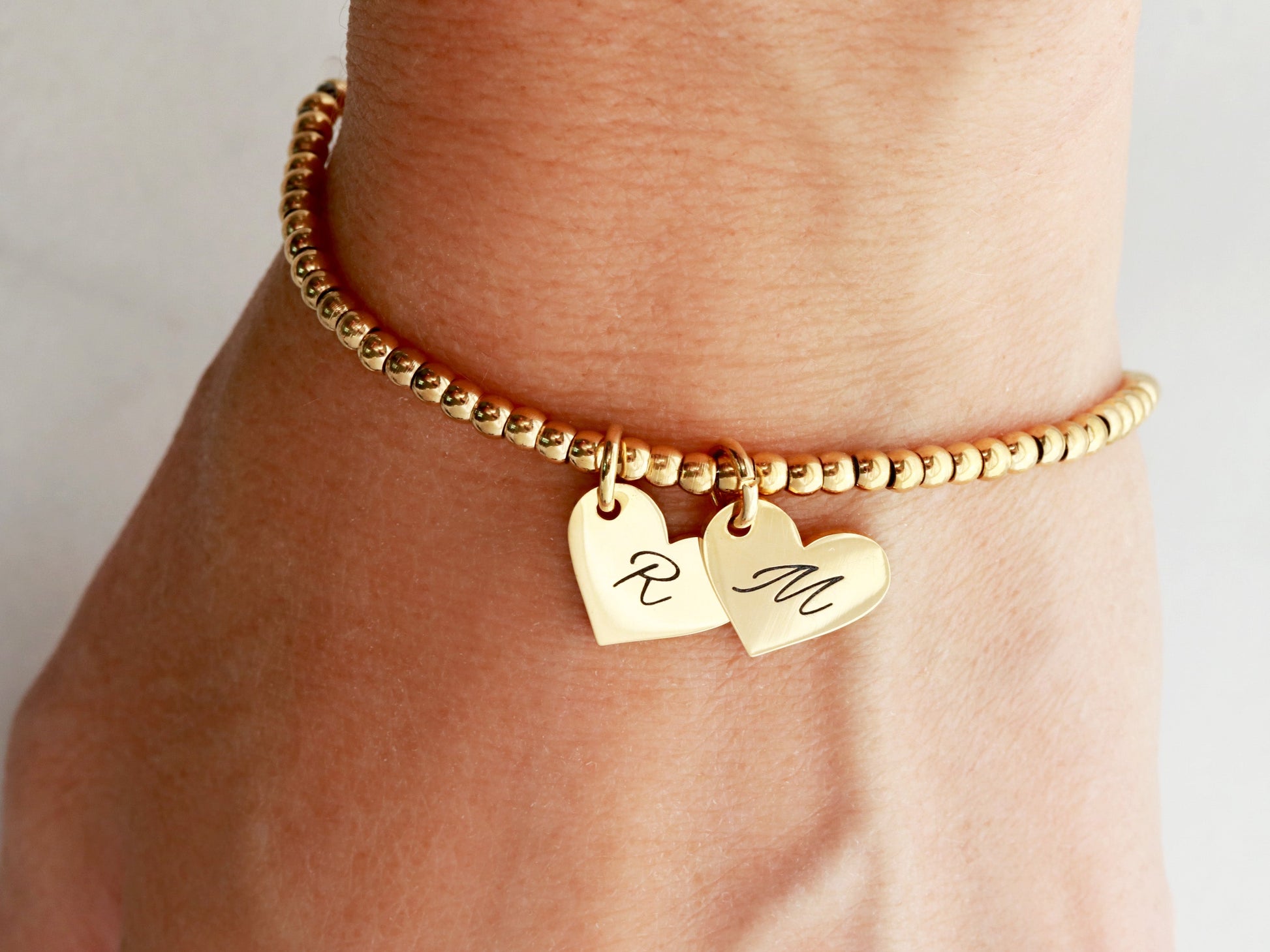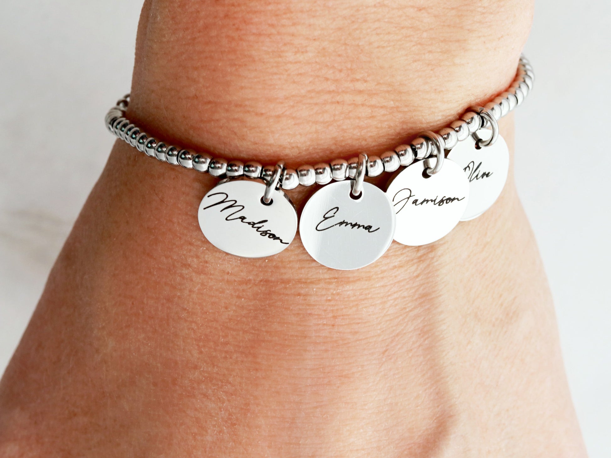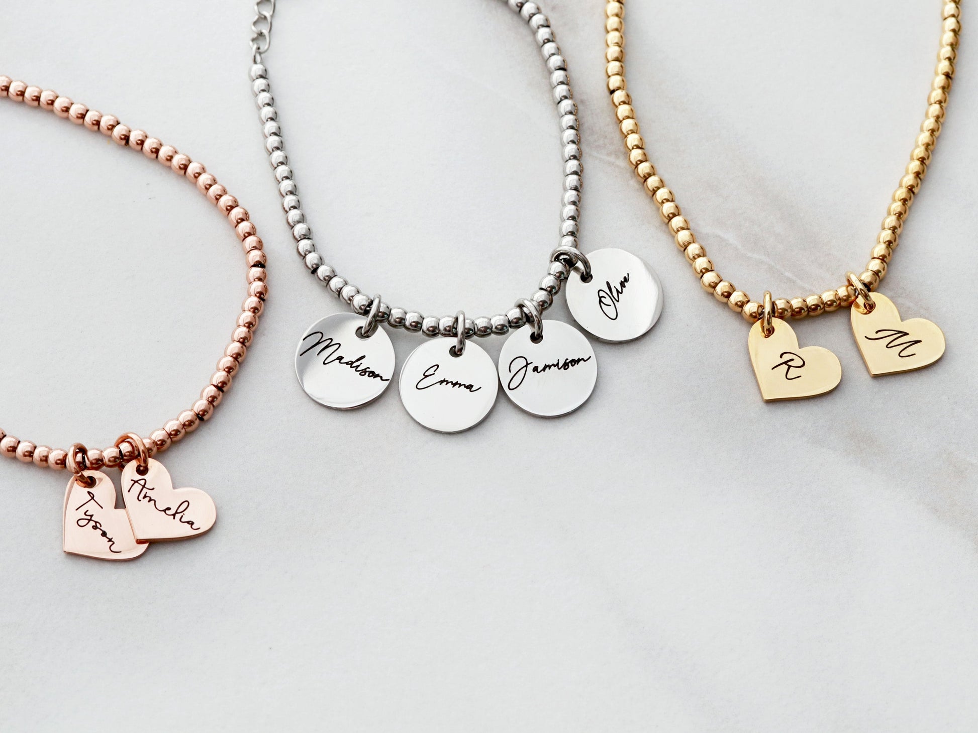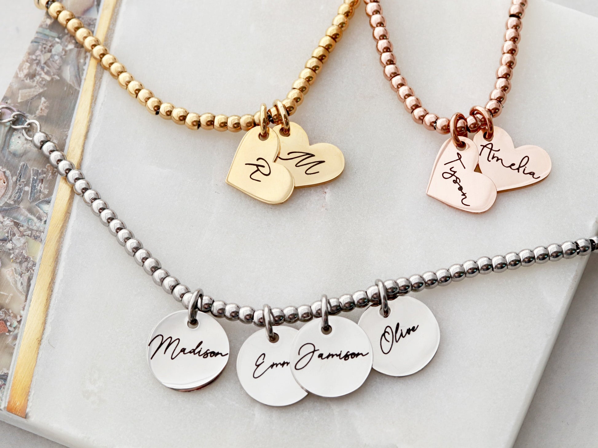 Nos bracelets de perles peuvent désormais être personnalisés avec des charms gravés. Initiales, noms, dates, mots d'encouragement ou phrases personnelles peuvent être gravés sur des charms en forme de cœur ou de disque, disponibles en plusieurs tailles.