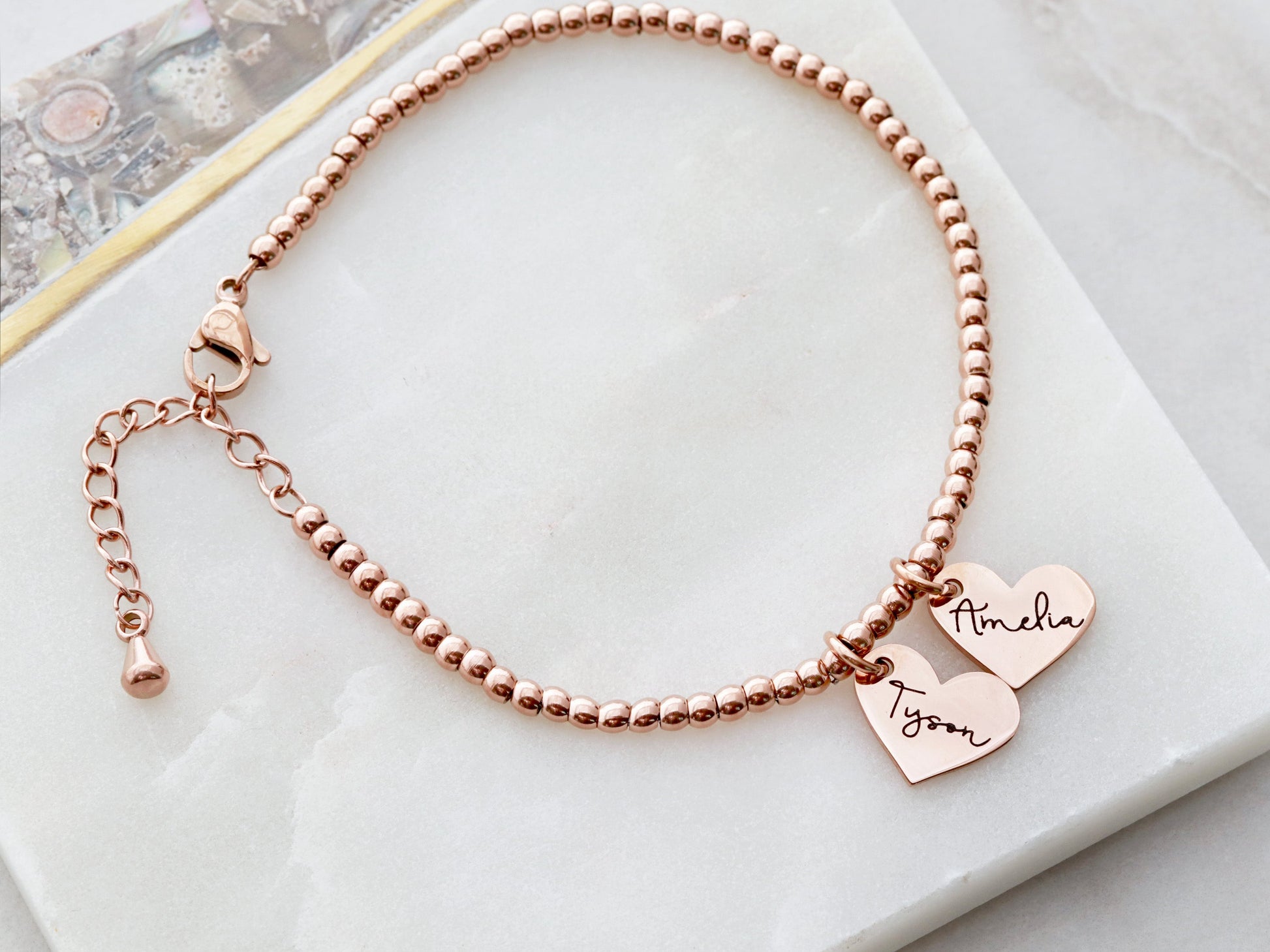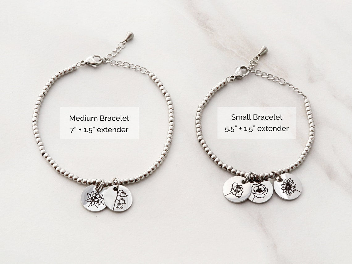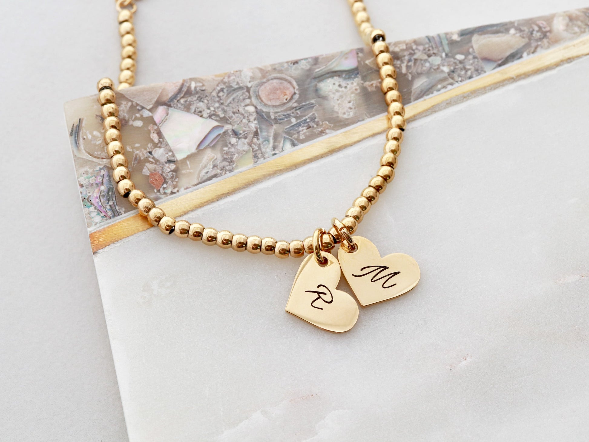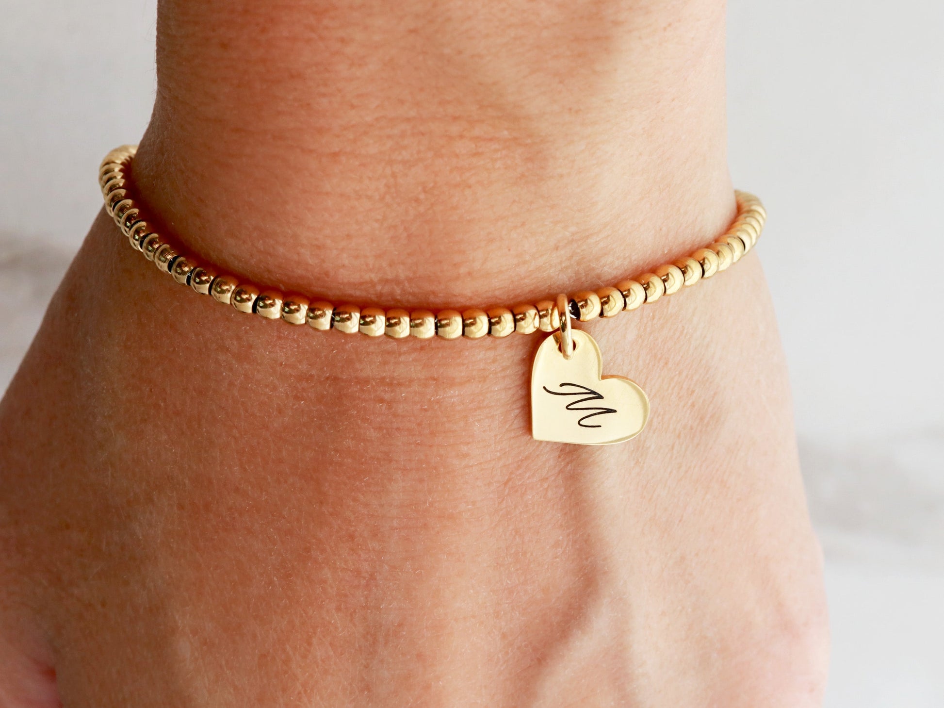 Nos bracelets de perles peuvent désormais être personnalisés avec des charms gravés. Initiales, noms, dates, mots d'encouragement ou phrases personnelles peuvent être gravés sur des charms en forme de cœur ou de disque, disponibles en plusieurs tailles.