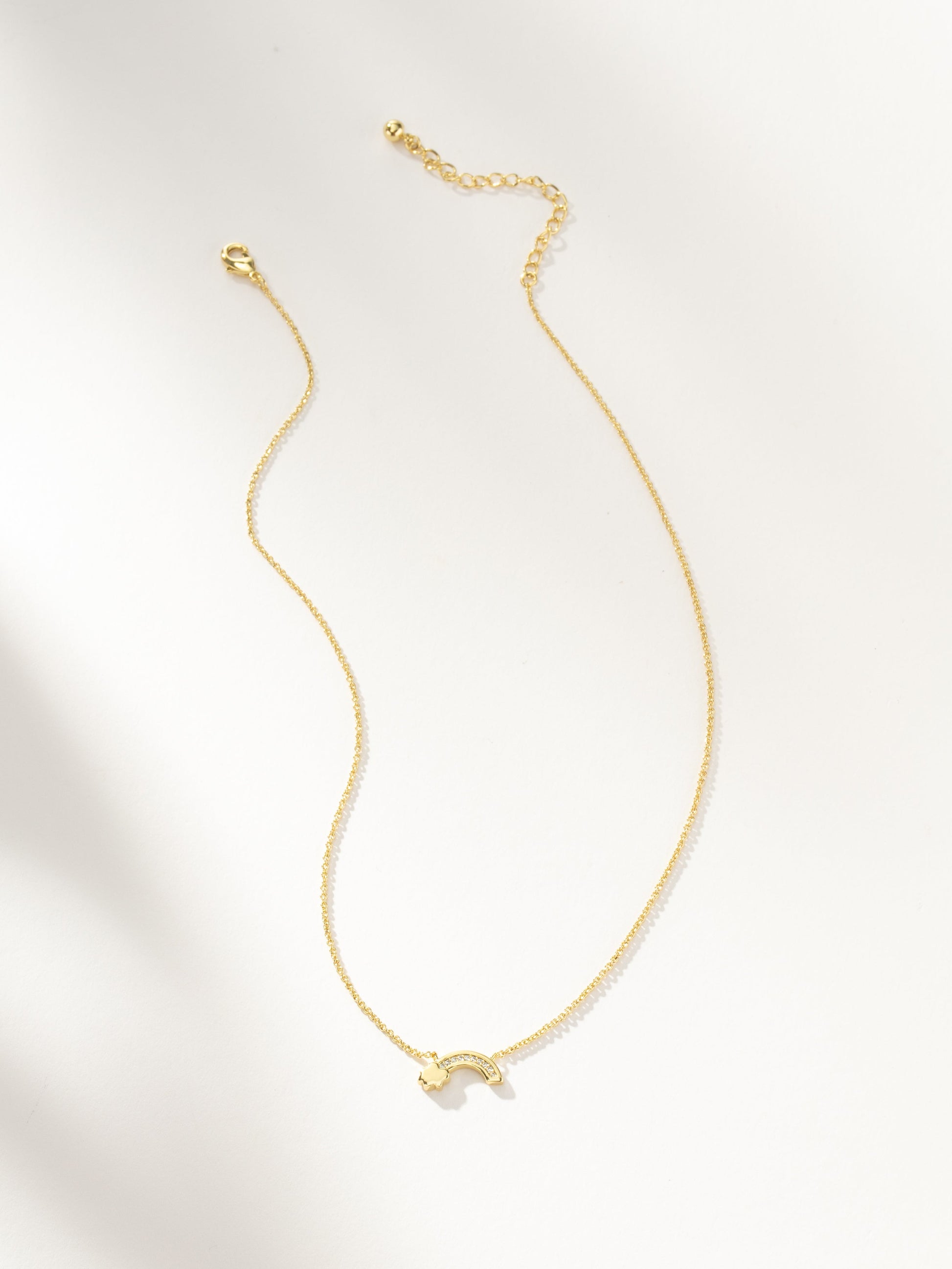 Notre collier arc-en-ciel est votre prochain indispensable à superposer. Ce collier doré arbore un pendentif arc-en-ciel scintillant, parfait pour compléter votre look quotidien. Il s'accorde parfaitement avec tous les colliers de votre collection, mais ne vous fiez pas à notre parole ; découvrez-le par vous-même.