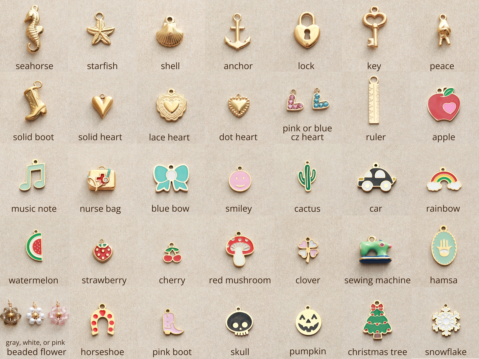 Les breloques vendues séparément sont disponibles ici : https://www.tomdesignshop.com/collections/charm-bar/products/add-a-charm