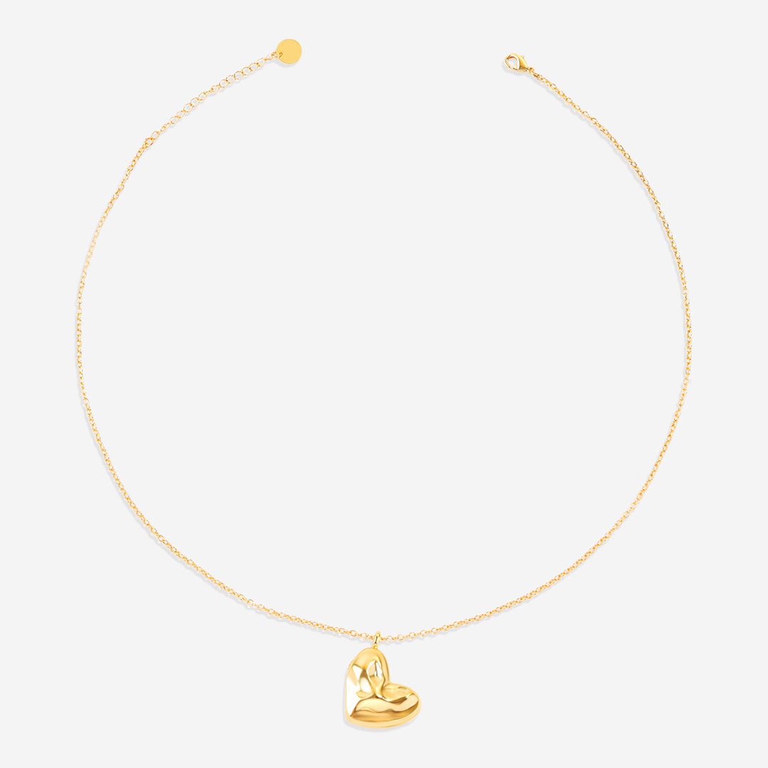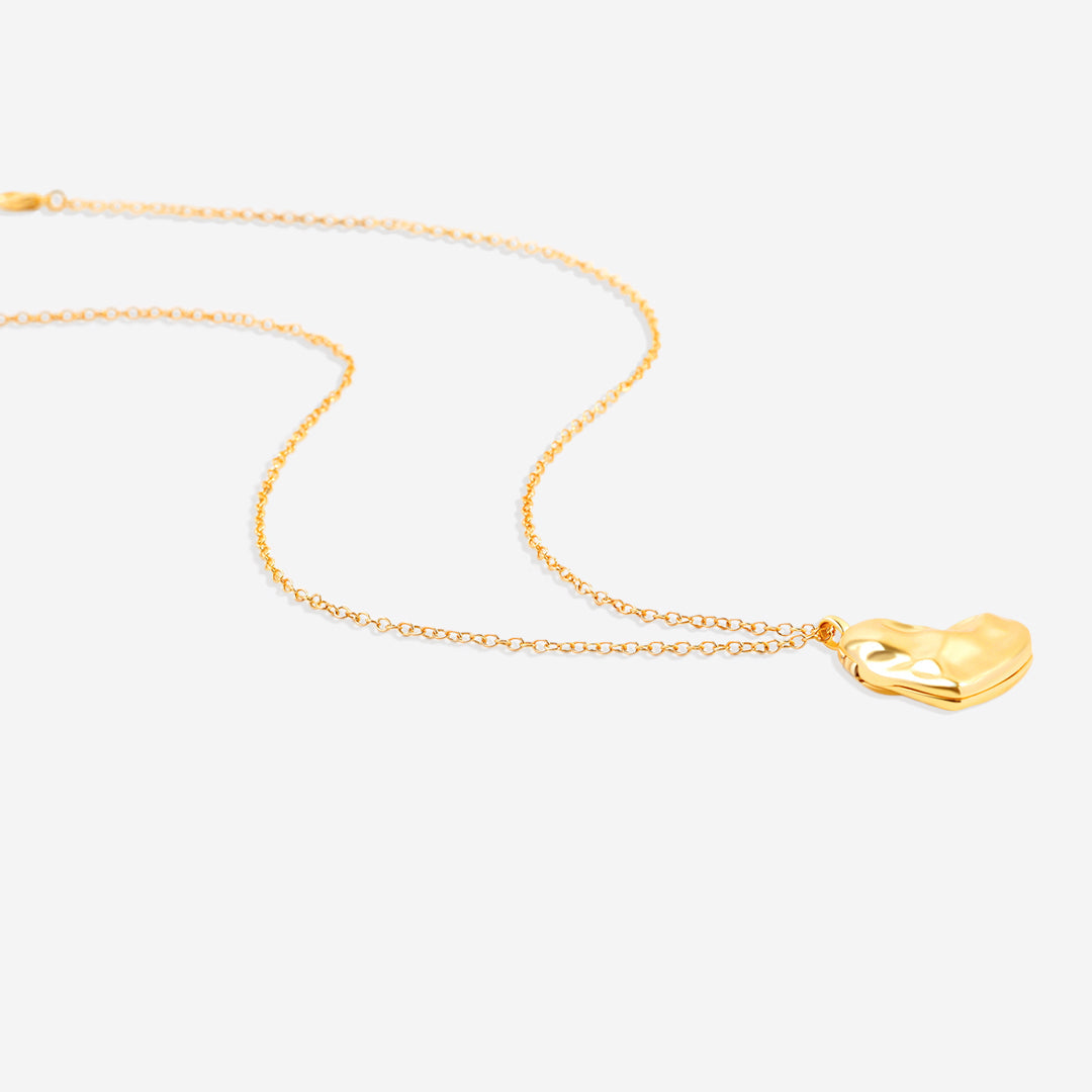 Mint & Lily's Handmade Hammered Heart Photo Locket Necklace features a beautifully crafted heart-shaped locket with a hammered texture, adding a unique and artisanal touch. The locket opens to hold cherished photos or mementos, making it a deeply personal keepsake.