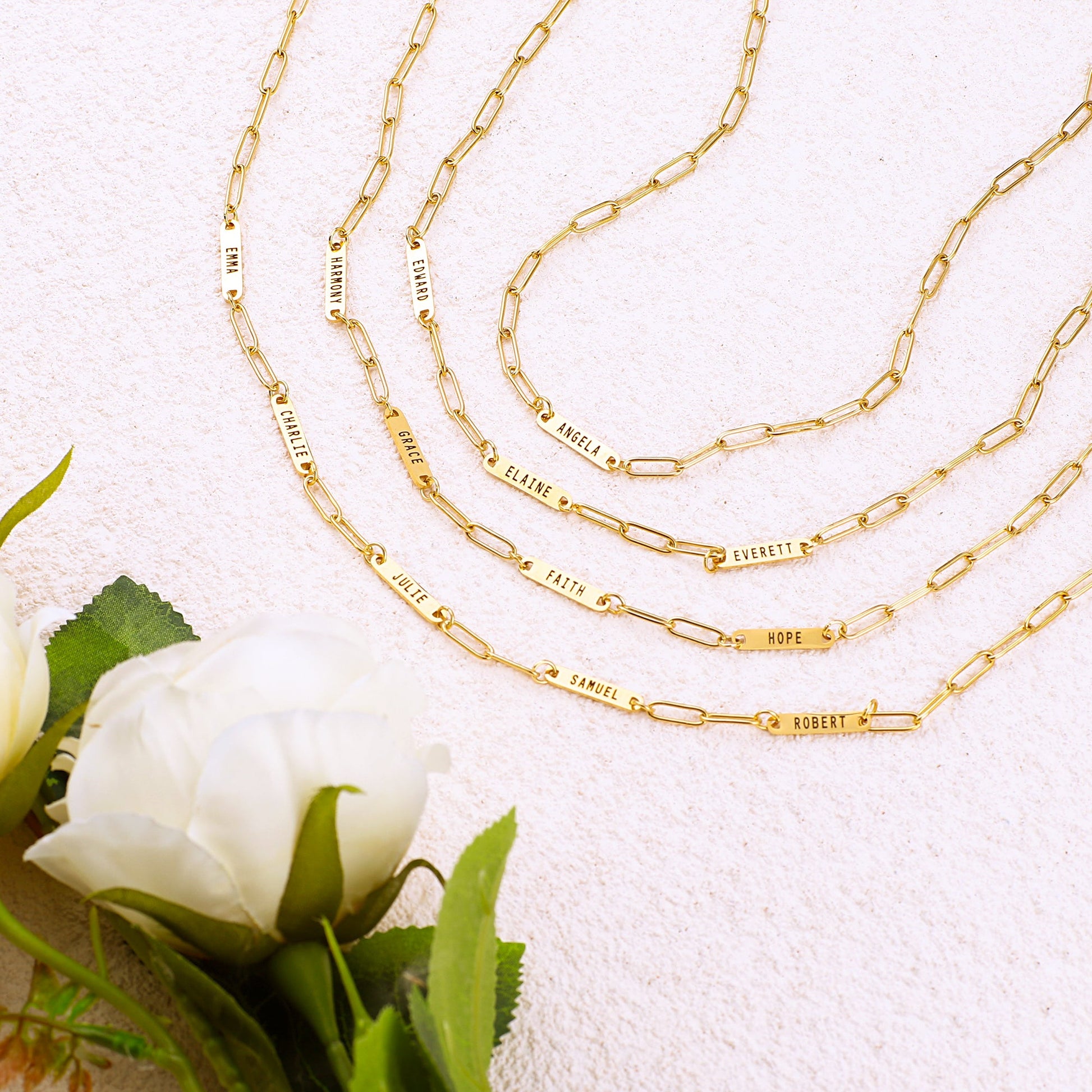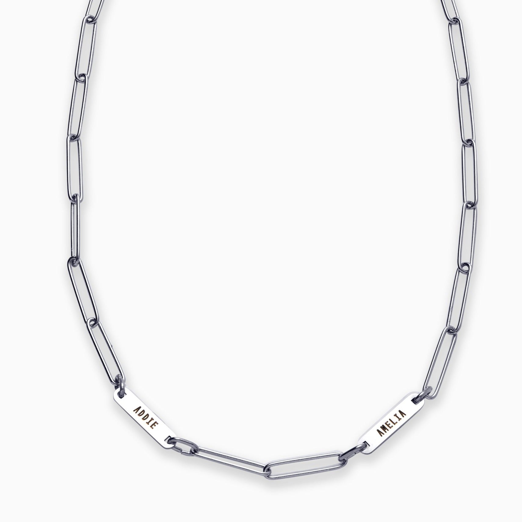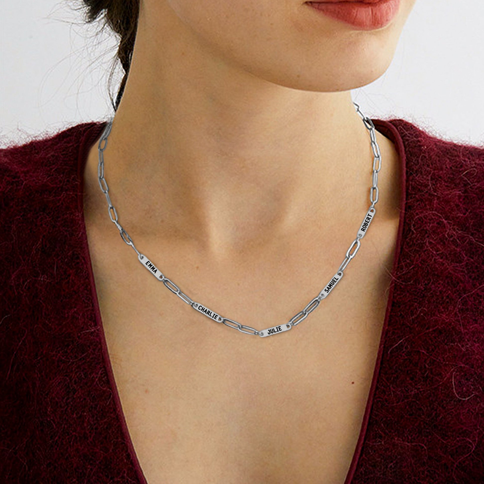 Personalize this classic, elegant paperclip design necklace with 1 to 5 names you want to keep close to your heart.