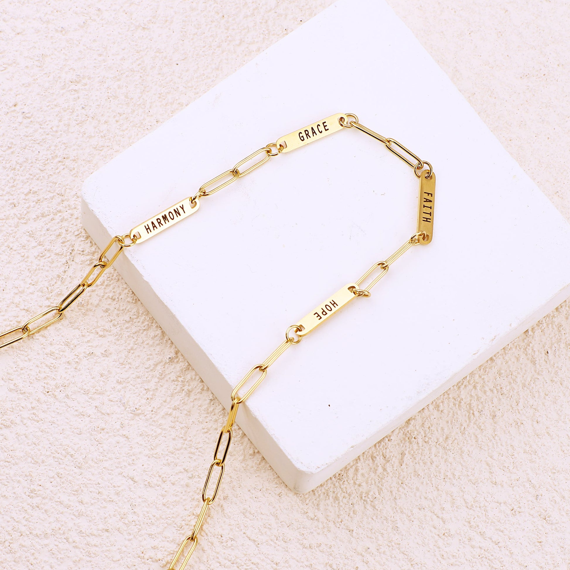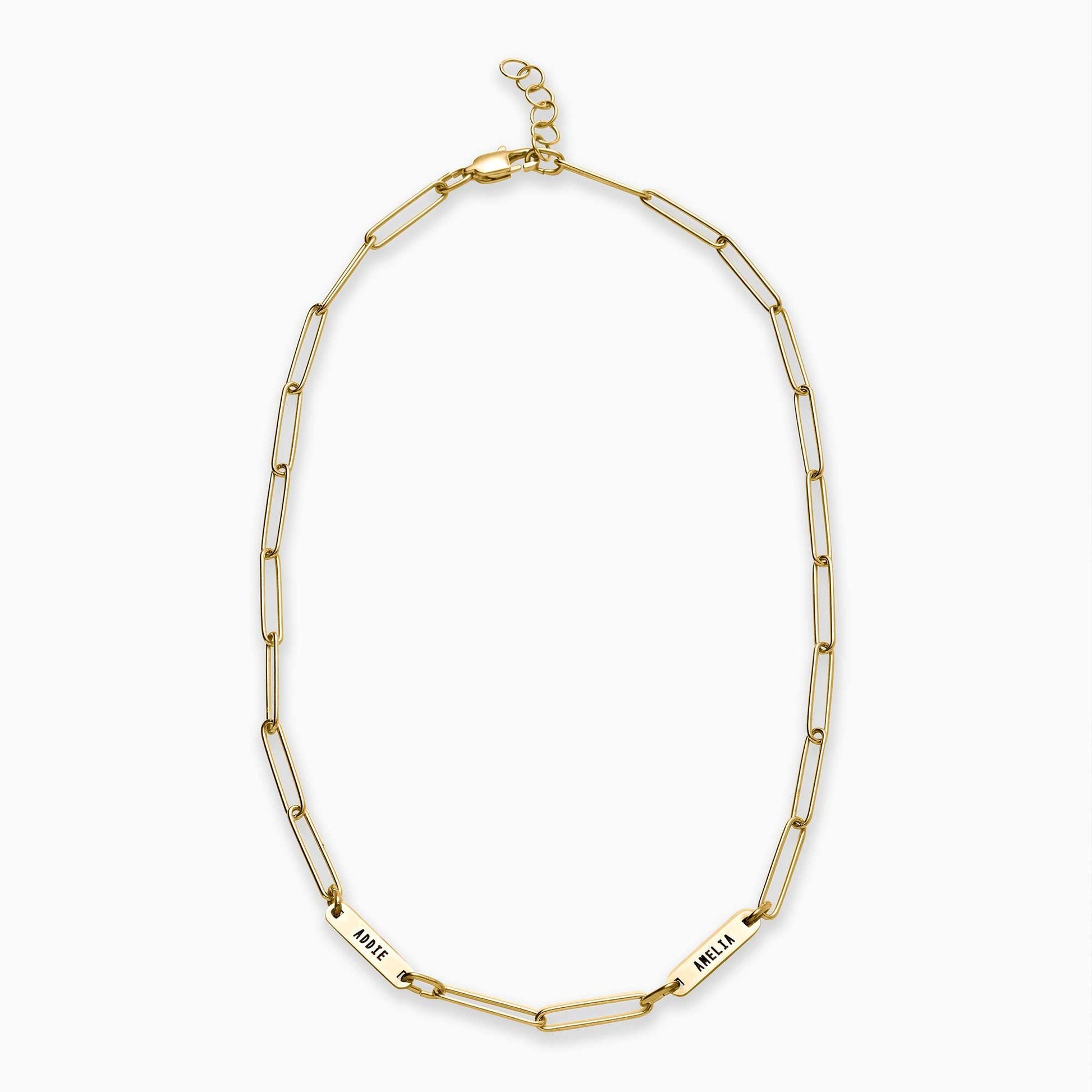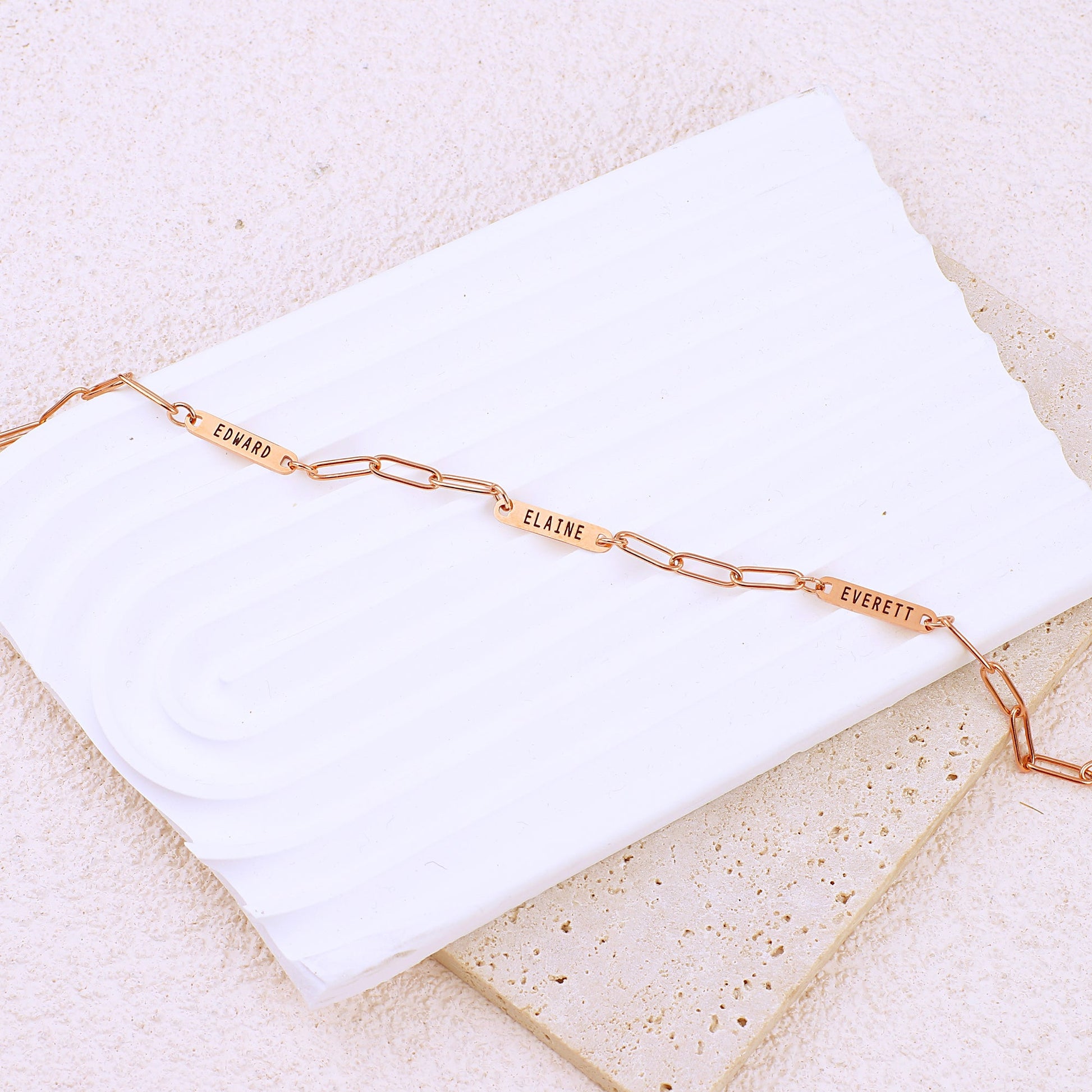 Personalize this classic, elegant paperclip design necklace with 1 to 5 names you want to keep close to your heart.