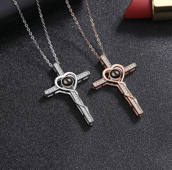 Custom Silver Cross Heart Hidden Photo Necklace